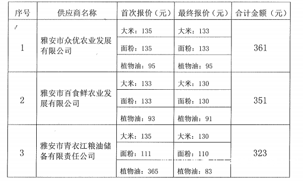 四川兴雅建设工程管理有限公司食材(米面油)采购配送服务项目已依照相关规定于2021年11月22日10:00(北京时间)在四川兴雅建设工程管理有限公司(四川省雅安市雨城区大兴街道双创东路66号)二楼实施竞争性谈判。现将谈判结果公示如下:
